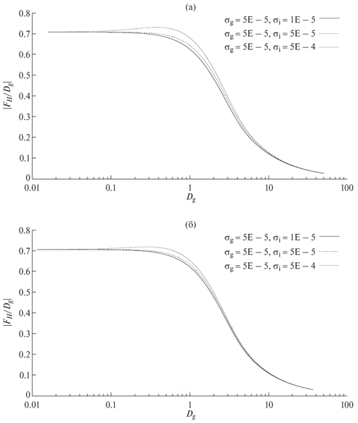 Рис. 2. Зависимость FHDg как функции параметра Dg для ряда значений электродинамических параметров волновода и отношения высоты волновода к расстоянию от источника: (a) – h/p = 0.8, (б) – h/p = 1.1.