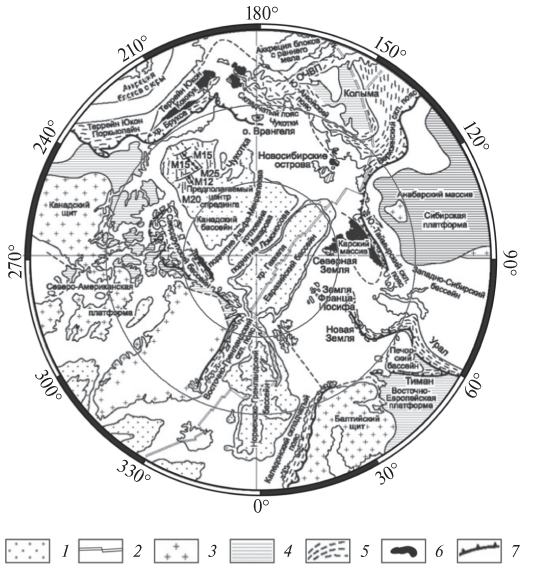 Рис. 1. Главные геологические структуры Арктики по работе [Зоненшайн, Натапов, 1987]: 1 – океанические бассейны глубже 2000 м, нанесены изобаты 2000 и 3000 м; 2 – активный спрединговый центр; 3–5 – континентальные структуры (3 – щиты; 4 – платформы; 5 – орогенические пояса); 6 – древние массивы, остатки континента Арктида; 7 – фронт складчатости; М12, М15, М20, М25 – мезозойские магнитные аномалии.