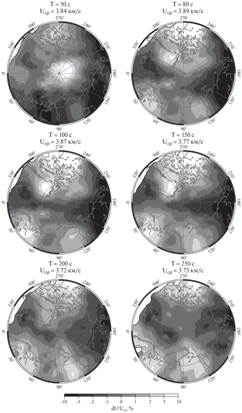 Карты для более высоких периодов колебаний (до 150 с) отражают распределение горизонтальных неоднородностей в мантийной части литосферы и в астеносфере, а для периодов более 150 с на характер дисперсии скоростей поверхностных волн оказывают влияние подастеносферные слои верхней мантии и нижняя мантия. Максимальные значения вариаций групповых скоростей (до +5%) на этих периодах приурочены к Канадскому и Балтийским щитам, что свидетельствует о большой мощности литосферы (до 280 км) и высоких скоростях поперечных волн в ней [Chen et al., 2007; Olsson et al., 2007; Darbyshire et al., 2013; Grad et al., 2014]. Также повышенными значениями скоростей (+1… +3%) характеризуются Восточно-Европейская и Сибирская платформы, причем под последней с увеличением периода данная особенность становится более выраженной. Минимальные значения скоростей (до –10%) приурочены к складчатым поясам северо-востока Евразии и Аляски, а также к бассейну Берингова моря, где происходит современная субдукция Тихоокеанской плиты.