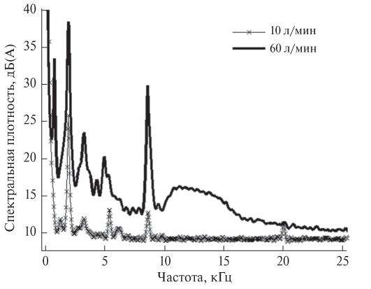 Как следует из рис. 1, типичные частоты акустического шума находятся в диапазоне 1017 кГц. Резкие пики на частотах до 10 кГц обусловлены резонансами и шумом экспериментальной установки. Особенности спектра до 10 кГц имеют место и при низком расходе, что отличается от спектра в диапазоне от 10 до 17 кГц, которого нет при низких расходах. Причем, согласно полученным экспериментальным данным, частотный диапазон акустического шума слабо зависит от расхода, что согласуется с литературными данными [Метелев, 2016; Николаев, 1992].