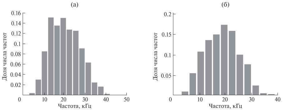 Рис. 4. Распределение числа собственных колебаний по частотам (шаг 3 кГц), рассчитанное по нормальному распределению пор (2.2): (а) – среднее число горлышек, соединенных с одной порой, равно 2.6; (б) – среднее число горлышек, соединенных с одной порой, равно 2.1.
