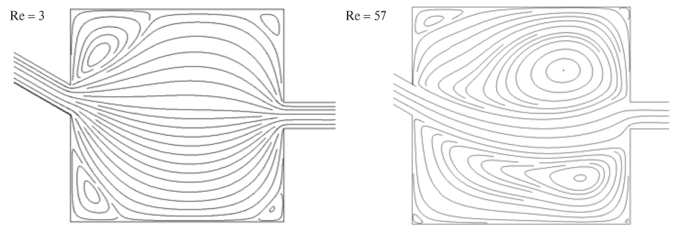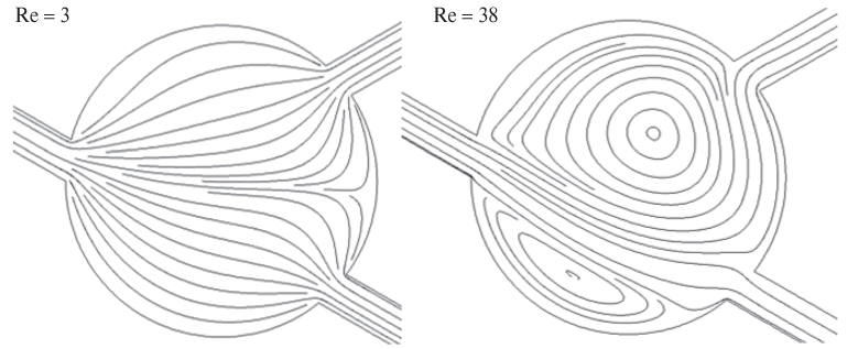 Нами проведен расчет (COMSOL multiphysics) течения азота в двух различных двумерных геометриях пор: круглой (рис. 5) и квадратной (рис. 6) (с целью анализа влияния прямого угла на формирование вихрей). В качестве граничных условий задан профиль скорости на левой границе левого горлышка и постоянное давление на правой границе правого горлышка. Число Рейнольдса вычислено исходя из диаметра левого горлышка, как характерного размера геометрии течения, и скорости потока в нем. Численные расчеты показывают, что микровихри формируются в порах при малых значениях Рейнольдса порядка ~ 110, что соответствует условиям течения в призабойной зоне газовой скважины. Критическое число Рейнольдса в значительной степени зависит от геометрии пор.