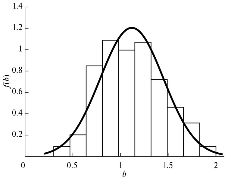 Рис. 1. Эмпирическое распределение оценок параметра b. Плотность f(b) (гистограмма) построена по 334 сериям афтершоков от землетрясений мира с Mm ≥ 6.5. Жирная линия – аппроксимация нормальным распределением со средним Eb = 1.12 и стандартным отклонением σb = 0.3.