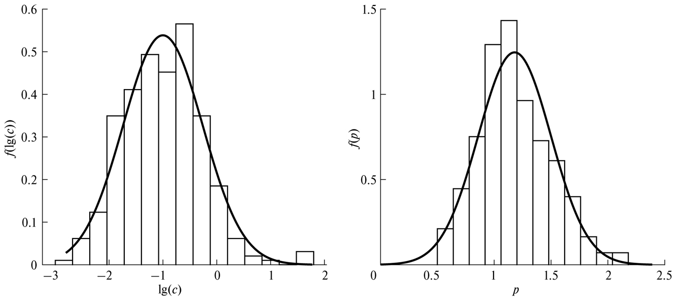Байесовская оценка апостериорного распределения оценок параметров с и p закона Омори MathType@MTEF@5@5@+= feaahqart1ev3aqatCvAUfeBSn0BKvguHDwzZbqefauqYLwySbsvUL 2yVrwzG00uaeXatLxBI9gBamXvP5wqSXMqHnxAJn0BKvguHDwzZbqe gm0B1jxALjhiov2DaeHbuLwBLnhiov2DGi1BTfMBaebbnrfifHhDYf gasaacH8srps0lbbf9q8WrFfeuY=Hhbbf9v8qqaqFr0xc9pk0xbba9 q8WqFfea0=yr0RYxir=Jbba9q8aq0=yq=He9q8qqQ8frFve9Fve9Ff 0dmeaabaqaciGacaGaaeqabaWaaqaafaaakeaaryqqYLwySbacgaqc LbwaqaaaaaaaaaWdbiaa=nbiaaa@4556@ Утсу проводилась методом работы [Holschneider et al., 2012]. Следуя рекомендациям указанной работы, для параметра с поиск оптимального значения осуществлялся для величины lg(c). Для данной работы авторами разработана новая программа, допускающая использование произвольного априорного распределения параметров (в текущей версии оригинальной программы допускается использование лишь равномерного априорного распределения). Аналогично оценке параметра b, на данном этапе использовались равномерные априорные распределения параметра p в интервале [0.5, 2.5] и lg(c) в интервале [ MathType@MTEF@5@5@+= feaahqart1ev3aqatCvAUfeBSn0BKvguHDwzZbqefauqYLwySbsvUL 2yVrwzG00uaeXatLxBI9gBamXvP5wqSXMqHnxAJn0BKvguHDwzZbqe gm0B1jxALjhiov2DaeHbuLwBLnhiov2DGi1BTfMBaebbnrfifHhDYf gasaacH8srps0lbbf9q8WrFfeuY=Hhbbf9v8qqaqFr0xc9pk0xbba9 q8WqFfea0=yr0RYxir=Jbba9q8aq0=yq=He9q8qqQ8frFve9Fve9Ff 0dmeaabaqaciGacaGaaeqabaWaaqaafaaakeaaryqqYLwySbacgaqc LbwaqaaaaaaaaaWdbiaa=nbiaaa@4556@ 3, 1.7]. Полученные по 334 сериям эмпирическое распределение полученных оценок и его аппроксимация нормальным распределением показаны на рис. 2.