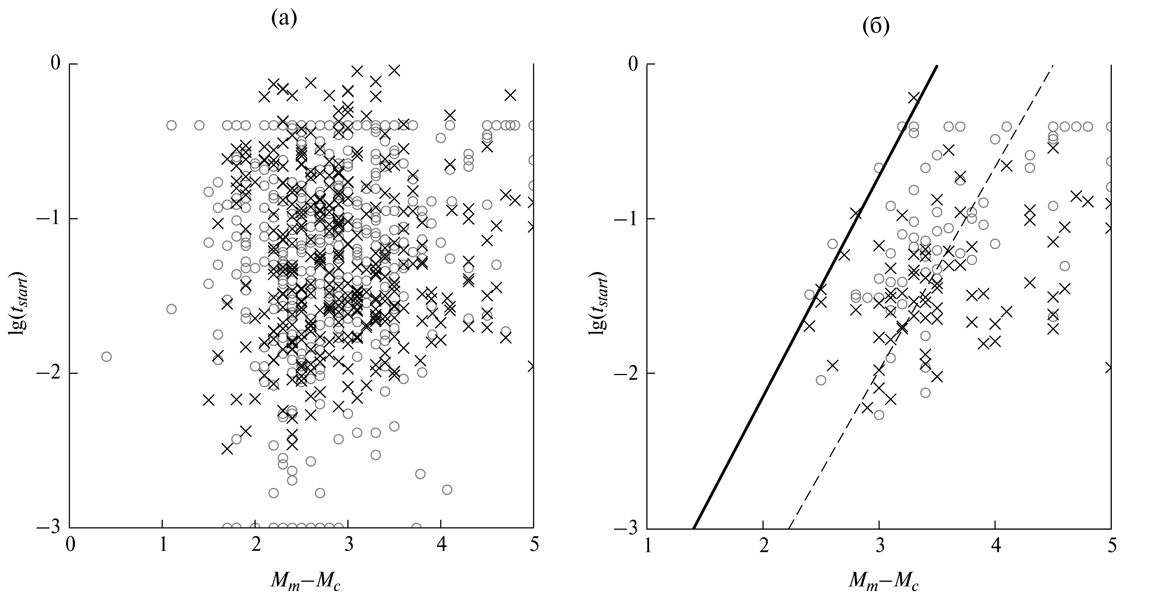 4. Fig. 3. Dependencies of the definitions of tstart on the difference in magnitudes Mm – Mc, obtained from the moving average (circles) and the actual estimate of the parameter c (crosses): (a) for all series; (b) - for series with the number of aftershocks of magnitude Mc and above not less than 100. The parameter Mc was determined by the MAXC method on the interval [0.01, 4]. The bold line is the envelope of a point on the graph; the dashed line corresponds to the equation from [Helmstetter et al., 2006]