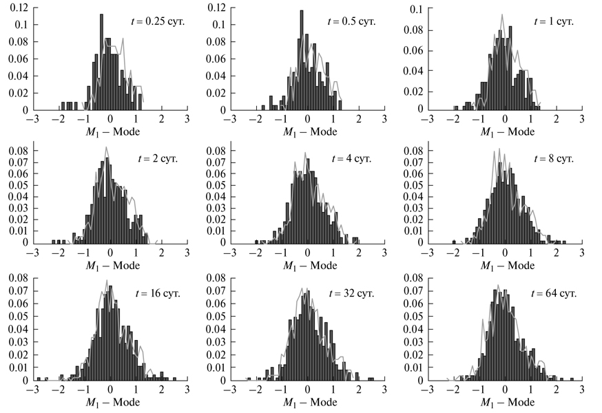 5. Fig. 4. Distributions of the difference between the actual magnitude of the strongest aftershock (t, 365 days) and the maximum of the distribution (mode) of estimating this value by the main method for 9 times t. The distributions are shown by histograms normalized to the number of aftershock series examined. A thin line for comparison shows similar distributions for estimates according to the dynamic law of Bot.