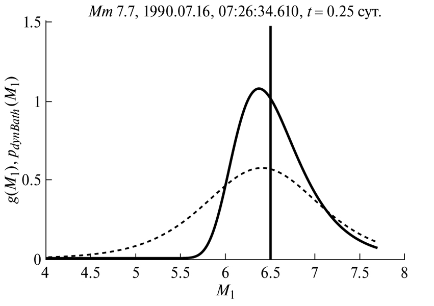 6. Fig. 5. An example of estimates of M1 (0.25 days, 365 days) for aftershocks of an earthquake of magnitude 7.7 (07.07.1990). The bold line is the distribution density according to the main method of this work, corresponds to the distribution function (6), the dashed line follows the dynamic law of Bot, corresponds to the distribution function (9). The magnitude of the strongest aftershock is shown by a vertical line.