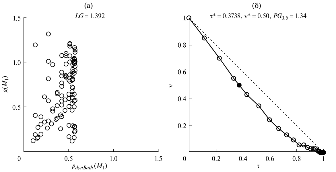 Диаграмма ошибок, которую мы здесь предлагаем, несколько отличается от стандартной. Поскольку прогноз можно считать тем лучше, чем ближе к максимуму плотности (моде) прогнозного распределения оказывается реализация, то в качестве управляющего параметра мы рассматриваем здесь расстояние δM от моды. Поэтому, чтобы сравнить тестируемую модель с моделью динамического закона Бота, мы определяем величину τ (доля тревог) как вероятность попадания величины M 1 t,T MathType@MTEF@5@5@+= feaahqart1ev3aqatCvAUfeBSjuyZL2yd9gzLbvyNv2CaerbuLwBLn hiov2DGi1BTfMBaeXatLxBI9gBaeXafv3ySLgzGmvETj2BSbqefm0B 1jxALjhiov2DaebbnrfifHhDYfgasaacHOaM0xg9vrFfpeea0xh9v8 qiW7rqqrFfpeea0xe9Lq=Jc9vqaqpepm0xbba9pwe9Q8fs0=yqaqpe pae9pg0FirpepeKkFr0xfr=xfr=xb9adbaqaaeGacaGaamaabeqaaq aabaqbaaGcbaaeaaaaaaaaa8qacaWGnbWdamacaY1gaaWcbGaGC9qa cGaGCHymaaWdaeqcaYfak8qadaqadaWdaeaapeGaamiDaiaacYcaca aMe8UaamivaaGaayjkaiaawMcaaaaa@492A@ в интервал E dynBath t δM, E dynBath t +δM , MathType@MTEF@5@5@+= feaahqart1ev3aqatCvAUfeBSjuyZL2yd9gzLbvyNv2CaerbuLwBLn hiov2DGi1BTfMBaeXatLxBI9gBaeXafv3ySLgzGmvETj2BSbqefm0B 1jxALjhiov2DaebbnrfifHhDYfgasaacHOaM0xg9vrFfpeea0xh9v8 qiW7rqqrFfpeea0xe9Lq=Jc9vqaqpepm0xbba9pwe9Q8fs0=yqaqpe pae9pg0FirpepeKkFr0xfr=xfr=xb9adbaqaaeGacaGaamaabeqaaq aabaqbaaGcbaaeaaaaaaaaa8qadaWadaWdaeaapeGaamyra8aadaWg aaWcbaWdbiacOb4GKbGaiGgGdMhacGaAaoOBaiacOb4GcbGaiGgGdg gacGaAaoiDaiacOb4GObaapaqabaGccaaMb8+dbmaabmaapaqaa8qa caWG0baacaGLOaGaayzkaaGaeyOeI0IaeqiTdqMaamytaiaaygW7ca GGSaGaamyra8aadaWgaaWcbaWdbiacOb4GKbGaiGgGdMhacGaAaoOB aiacOb4GcbGaiGgGdggacGaAaoiDaiacOb4GObaapaqabaGccaaMb8 +dbmaabmaapaqaa8qacaWG0baacaGLOaGaayzkaaGaey4kaSIaeqiT dqMaamytaaGaay5waiaaw2faaiaacYcaaaa@6E66@ а величину ν (доля пропусков цели) MathType@MTEF@5@5@+= feaahqart1ev3aqatCvAUfeBSn0BKvguHDwzZbqefauqYLwySbsvUL 2yVrwzG00uaeXatLxBI9gBamXvP5wqSXMqHnxAJn0BKvguHDwzZbqe gm0B1jxALjhiov2DaeHbuLwBLnhiov2DGi1BTfMBaebbnrfifHhDYf gasaacH8srps0lbbf9q8WrFfeuY=Hhbbf9v8qqaqFr0xc9pk0xbba9 q8WqFfea0=yr0RYxir=Jbba9q8aq0=yq=He9q8qqQ8frFve9Fve9Ff 0dmeaabaqaciGacaGaaeqabaWaaqaafaaakeaaryqqYLwySbacgaqc LbwaqaaaaaaaaaWdbiaa=nbiaaa@4556@ число случаев, когда M i,1 t,T <E t δM MathType@MTEF@5@5@+= feaahqart1ev3aqatCvAUfeBSjuyZL2yd9gzLbvyNv2CaerbuLwBLn hiov2DGi1BTfMBaeXatLxBI9gBaeXafv3ySLgzGmvETj2BSbqefm0B 1jxALjhiov2DaebbnrfifHhDYfgasaacHOaM0xg9vrFfpeea0xh9v8 qiW7rqqrFfpeea0xe9Lq=Jc9vqaqpepm0xbba9pwe9Q8fs0=yqaqpe pae9pg0FirpepeKkFr0xfr=xfr=xb9adbaqaaeGacaGaamaabeqaaq aabaqbaaGcbaaeaaaaaaaaa8qacaWGnbWdamaaBaaaleaapeGaamyA aiaacYcacaaMc8UaaGymaaWdaeqaaOWdbmaabmaapaqaa8qacaWG0b GaaiilaiaaysW7caWGubaacaGLOaGaayzkaaGaeyipaWJaamyramaa bmaapaqaa8qacaWG0baacaGLOaGaayzkaaGaeyOeI0IaeqiTdqMaam ytaaaa@5096@ или M i,1 t,T >E t +δM, MathType@MTEF@5@5@+= feaahqart1ev3aqatCvAUfeBSjuyZL2yd9gzLbvyNv2CaerbuLwBLn hiov2DGi1BTfMBaeXatLxBI9gBaeXafv3ySLgzGmvETj2BSbqefm0B 1jxALjhiov2DaebbnrfifHhDYfgasaacHOaM0xg9vrFfpeea0xh9v8 qiW7rqqrFfpeea0xe9Lq=Jc9vqaqpepm0xbba9pwe9Q8fs0=yqaqpe pae9pg0FirpepeKkFr0xfr=xfr=xb9adbaqaaeGacaGaamaabeqaaq aabaqbaaGcbaaeaaaaaaaaa8qacaWGnbWdamaaBaaaleaapeGaamyA aiaacYcacaaMe8UaaGymaaWdaeqaaOWdbmaabmaapaqaa8qacaWG0b GaaiilaiaaysW7caWGubaacaGLOaGaayzkaaGaeyOpa4Jaamyramaa bmaapaqaa8qacaWG0baacaGLOaGaayzkaaGaey4kaSIaeqiTdqMaam ytaiaacYcaaaa@5141@ где E(t) MathType@MTEF@5@5@+= feaahqart1ev3aqatCvAUfeBSn0BKvguHDwzZbqefauqYLwySbsvUL 2yVrwzG00uaeXatLxBI9gBamXvP5wqSXMqHnxAJn0BKvguHDwzZbqe gm0B1jxALjhiov2DaeHbuLwBLnhiov2DGi1BTfMBaebbnrfifHhDYf gasaacH8srps0lbbf9q8WrFfeuY=Hhbbf9v8qqaqFr0xc9pk0xbba9 q8WqFfea0=yr0RYxir=Jbba9q8aq0=yq=He9q8qqQ8frFve9Fve9Ff 0dmeaabaqaciGacaGaaeqabaWaaqaafaaakeaaryqqYLwySbacgaqc LbwaqaaaaaaaaaWdbiaa=nbiaaa@4556@ мода распределения для оцениваемой модели, а мода распределения для динамического закона Бота E dynBath t   MathType@MTEF@5@5@+= feaahqart1ev3aqatCvAUfeBSjuyZL2yd9gzLbvyNv2CaerbuLwBLn hiov2DGi1BTfMBaeXatLxBI9gBaeXafv3ySLgzGmvETj2BSbqefm0B 1jxALjhiov2DaebbnrfifHhDYfgasaacHOaM0xg9vrFfpeea0xh9v8 qiW7rqqrFfpeea0xe9Lq=Jc9vqaqpepm0xbba9pwe9Q8fs0=yqaqpe pae9pg0FirpepeKkFr0xfr=xfr=xb9adbaqaaeGacaGaamaabeqaaq aabaqbaaGcbaaeaaaaaaaaa8qacaWGfbWdamaaBaaaleaapeGaamiz aiaadMhacaWGUbGaamOqaiaadggacaWG0bGaamiAaaWdaeqaaOWdbm aabmaapaqaa8qacaWG0baacaGLOaGaayzkaaGaaiiOaaaa@4952@ определена соотношением (10). Точки на диаграмме при разных значениях δM MathType@MTEF@5@5@+= feaahqart1ev3aqatCvAUfeBSjuyZL2yd9gzLbvyNv2CaerbuLwBLn hiov2DGi1BTfMBaeXatLxBI9gBaeXafv3ySLgzGmvETj2BSbqefm0B 1jxALjhiov2DaebbnrfifHhDYfgasaacHOaM0xg9vrFfpeea0xh9v8 qiW7rqqrFfpeea0xe9Lq=Jc9vqaqpepm0xbba9pwe9Q8fs0=yqaqpe pae9pg0FirpepeKkFr0xfr=xfr=xb9adbaqaaeGacaGaamaabeqaaq aabaqbaaGcbaaeaaaaaaaaa8qacqaH0oazcaWGnbaaaa@4059@ образуют «траекторию ошибок». Чем в среднем относительно меньше расстояние от реализаций до моды, тем дальше от диагонали будет находиться «траектория» и тем лучше тестируемый метод. Тангенс наклона прямой на диаграмме ошибок, проходящей от точки (0.1) через точку траектории ошибок, называется вероятностным выигрышем (probability gain) [Molchan, 1991; Shebalin et al., 2014]. Для удобства сравнения для разных t мы будем рассматривать эту величину при ν 0.5, обозначив е