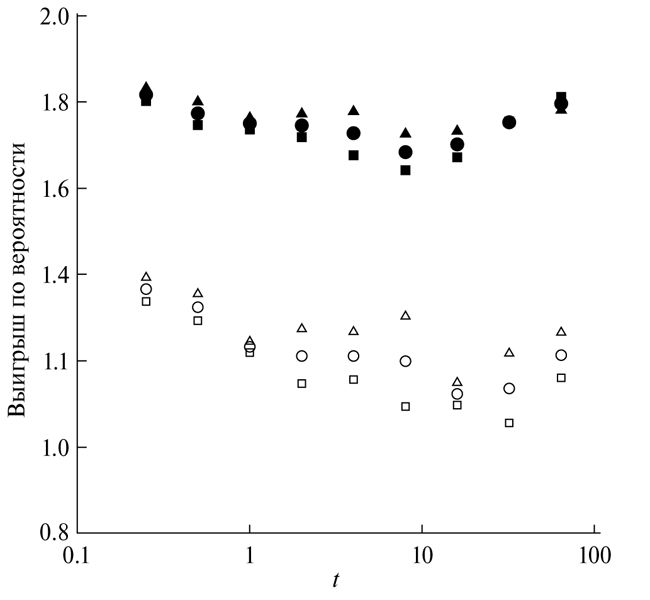 Рис. 7. Сравнение критериев качества относительно динамического закона Бота (выигрыша по вероятности) для ретроспективных оценок по основному варианту и для «идеального прогноза», в котором оценка числа событий представительной магнитуды на прогнозных интервалах (t, 365 сут.) заменена на их фактическое число. Треугольниками показаны значения критерия LG, квадратами PG0.5, кружками – (LG + PG0.5)/2. Закрашены символы, соответствующие «идеальному прогнозу».
