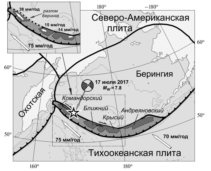 Согласно данным GNSS [Cross, Freymueller, 2008] крупные блоки перемещаются вдоль дуги в западном направлении (рис. 1, врезка). Для трех восточных блоков соответствующие компоненты скорости не превышают 15 мм/год. Такие скорости малы по сравнению с относительным движением Тихоокеанской плиты, поэтому большинство пограничных блоков (включая Берингию и Алеутскую дугу) в первом приближении часто относят к Северо-Американской плите. Исключение составляет Командорский блок, кинематика которого ближе к Тихоокеанской плите. Последняя в этом районе перемещается на северо-запад со скоростью около 75 мм/год [Argus, Gordon, 1991]. Командорский блок движется в том же направлении, но с меньшей скоростью: ~ 40–50 мм/год [Левин и др., 2012; Cross, Freymueller, 2008; Kogan et al., 2017]. Таким образом, Командорский блок перемещается достаточно быстро в том же направлении относительно медленной Берингии (удовлетворительные оценки ее скорости отсутствуют).