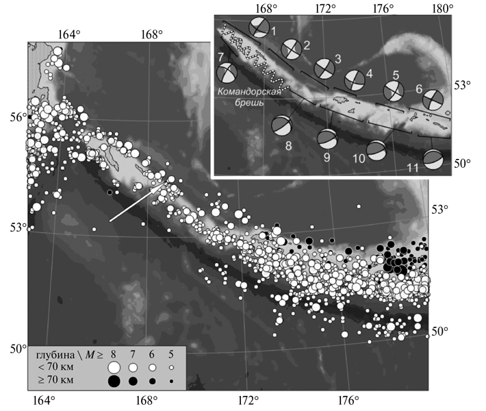 Вдоль южного края Берингии протянулась Алеутская островная дуга. Следуя [Geist et al., 1988] в ее центральной и западной части выделяется несколько отдельных, относительно крупных, приподнятых блоков, основные из которых, в соответствии с названием островов: Андреяновский, Крысий, Ближний. В этот ряд следует добавить и наиболее западный Командорский блок (рис. 1). Для южных, обращенных к Алеутскому желобу, склонов блоков и относительно опущенных межблоковых пространств характерен сложный рельеф с многочисленными отрогами и каньонами, в котором дешифрируются разломы, косые и поперечные по отношению к основному простиранию дуги. В противоположность этому с севера рассматриваемая область ограничена серией протяженных продольных впадин и линеаментов, судя по механизмам землетрясений – правосторонних сдвигов (рис. 2, врезка).