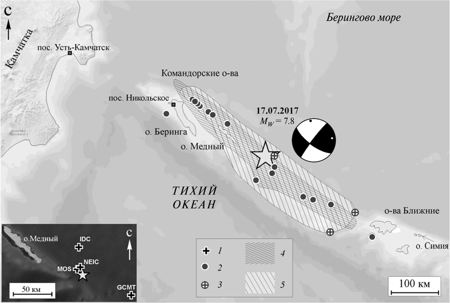 - Lay T., Ye L., Bai Ye., Cheung K.F., Kanamori H., Freymueller J., Steblov G.M., Kogan M.G. Rupture Along 400 km of the Bering Fracture Zone in the Komandorsky Islands Earthquake (MW = 7.8) of 17 July 2017 // Geophysical Research Letters. 2017. V. 44. № 24. P. 12161–12169. doi: 10.1002/2017 GL076148