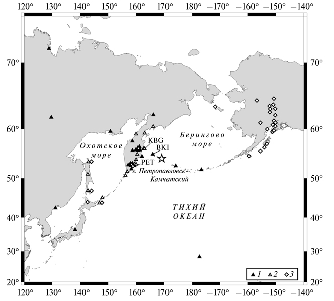 Рис. 4. Сейсмические станции, использовавшиеся в Региональном информационно-обрабатывающем центре (РИОЦ) «Петропавловск» для обработки Ближне-Алеутского землетрясения, его форшоков и афтершоков (1), в том числе привлекавшиеся для определения пиковых амплитуд колебаний грунта (2). Отмечены станции, привлекавшиеся для расчета тензора сейсмического момента (ТМС) (3). Приведены названия станций, упоминающихся в тексте статьи.