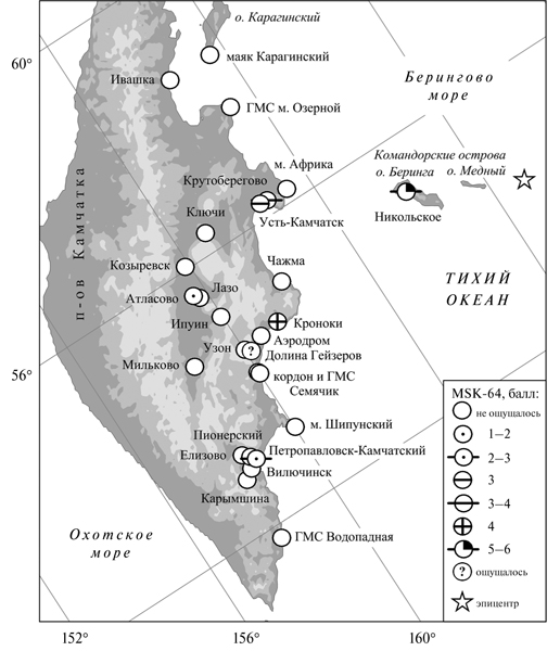 Основной Командорский блок с глубинами шельфа до 200 м и островами Беринга и Медным располагается между двумя зонами мелкофокусной сейсмичности, проходящими вдоль Алеутского желоба на юго-западе и разлома Беринг на северо-востоке. В обеих зонах надежно зафиксированы землетрясения с М ~ 7. Несколько более сильных событий, представленных в каталогах, соответствуют ранним периодам наблюдений и могут относиться к смежным регионам. В целом за время инструментальных наблюдений северо-восточная граница блока ведет себя заметно активнее, чем юго-западная.
