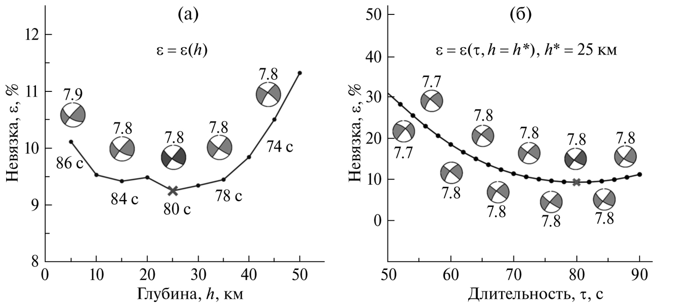 – полученные [Lay et al., 2017] и нами оценки длительности процесса вспарывания 70–90 с, по-видимому, следует относить к основному юго-восточному субочагу: комбинация длины (~200 км) и длительности дает оценку скорости распространения фронта вспарывания ~2.5 км/с. Эта оценка явно меньше скорости поперечных волн (3.9 км/с для приповерхностного слоя модели AK135f). Число Маха равно ~0.6;