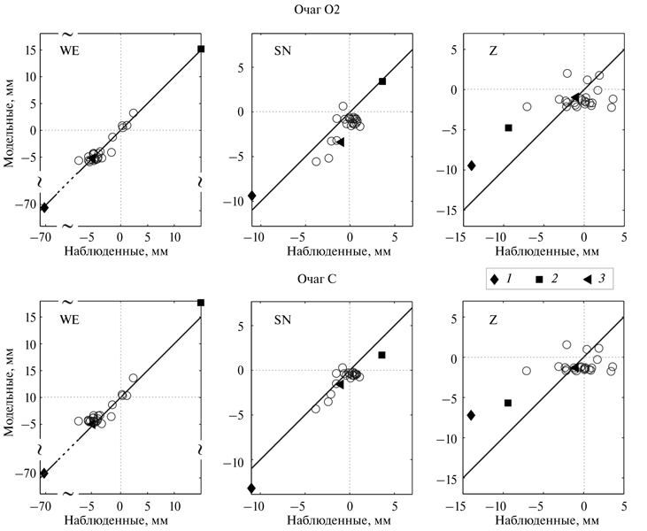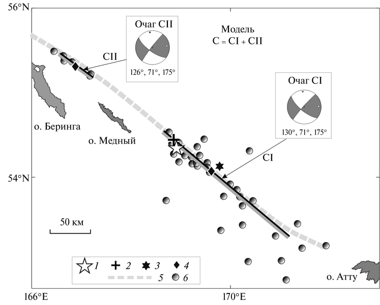 Эти недостатки простейшей модели удается устранить, предполагая, что главное событие содержало два близких по времени, но пространственно разнесенных по разлому Беринга субочага с размерами 200 × 20 км на юго-востоке и 50 × 20 км на северо-западе (рис. 10, модель С в табл. 6). Приведенные размеры субочагов выбраны по форме двух отдельных облаков афтершоков, возникших в течение первых часов после главного толчка (рис. 12б) и позже объединившихся. В рамках этой модели сценарий БАЗ можно представить следующим образом: