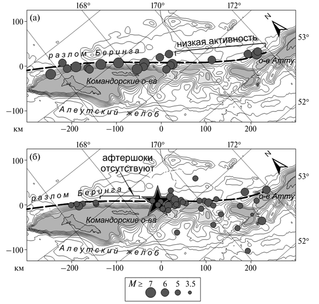 Поскольку основная полоса предыдущей сейсмичности восточнее Командорских островов смещается к югу, юго-восточная часть разлома Беринга в период, предшествовавший БАЗ, была менее активна, чем северо-западная (рис. 12а). За время, начиная с 1962 г. (когда точность определения гипоцентров позволяет достаточно надежно соотносить события с движениями по разлому), и до середины 2017 г. на участке (~300 км) разлома Беринга, ограничивающем с северо-востока Командорский блок, произошло 14 землетрясений с MW ≥ 5.5 (исключая два афтершока). За то же время юго-восточнее на оставшемся (~200 км) отрезке разлома зафиксировано лишь 3 события тех же магнитуд (исключая один афтершок). Отметим, что граница между указанными «активным» и «пассивным» сегментами разлома Беринга располагается всего в 20–30 км от эпицентра БАЗ. Ниже мы обсудим предположение о том, что основной разрыв БАЗ соответствовал подвижке по ранее относительно «запертому» юго-восточному участку разлома Беринга.