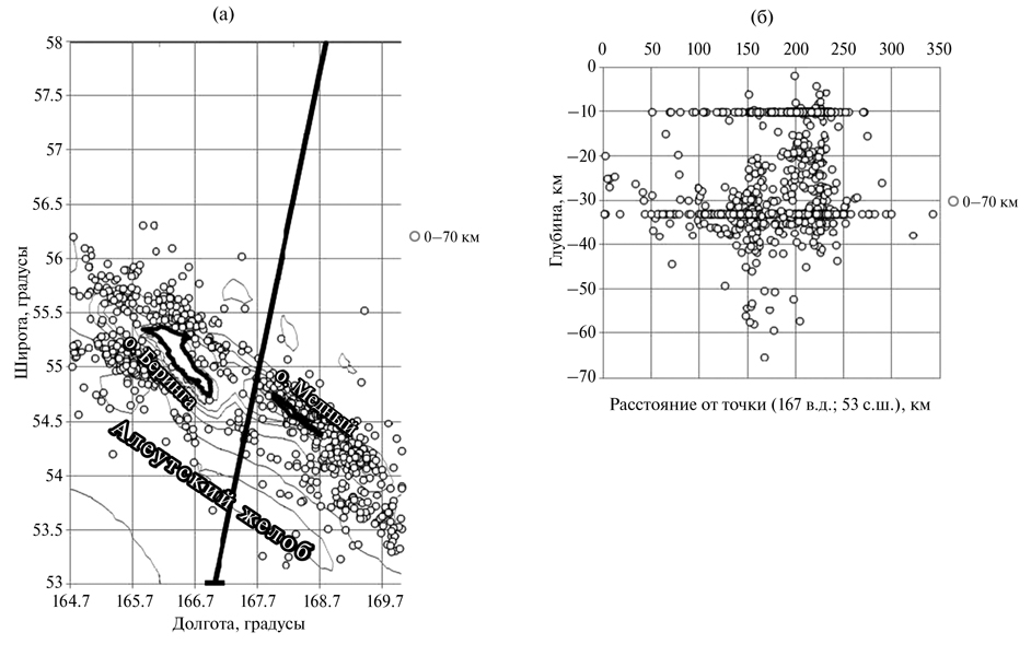 Рис. 4. (а) – Сечение (жирная прямая линия) через ансамбль эпицентров землетрясений (Ml ≥ 2.5; MW ≤ 6.9) в районе Лисьих островов (вид сверху) по данным каталога NEIC (2000–2018 гг.). Горизонтальной чертой на прямой линии показано начало отсчета на разрезе (рис. 4б) (2000–2018 гг.); (б) – вертикальный разрез гипоцентров землетрясений (Ml ≥ 2.5; MW ≤ 6.9) в районе Лисьих островов по данным каталога NEIC (2000–2018 гг.).