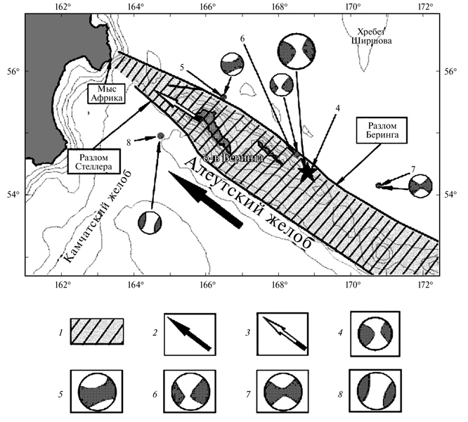 Рис. 7. Сейсмотектоническая карта эпицентральной области Ближне-Алеутского землетрясения 2017 г. Условные обозначения: 1 – Командорский блок; 2 – вектор движения Тихоокеанской плиты относительно Камчатки [Plate Motion Calculator, http://sps.unavco.org/crustal_motion/dxdt/model/]; 3 – вектор движения Командорского блока относительно Камчатки по данным GPS [Левин и др., 2002]; 4 – фокальный механизм главного события 17.07.2017 г.; 5 – фокальный механизм афтершока 25.01.2018 г. (MW = 6.2), 6 – фокальный механизм форшока 17.07.2017 г. вблизи о-ва Медный (MW = 6.2); 7 – фокальный механизм форшока 02.06.2017 г. вблизи Ближних островов (МW = 6.8); 8 – фокальный механизм землетрясения 20.12.2018 г., MW = 7.2. Все фокальные механизмы приведены по данным каталога [CMT – Global Centroid-Moment-Tensor (CMT) catalog Project, http://www.globalcmt.org/CMTsearch.html].