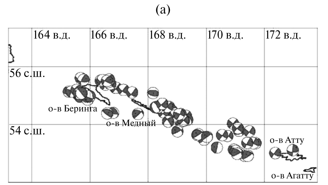 На северо-западе выбранной области вблизи острова Беринга одна из нодальных плоскостей усредненных механизмов очагов землетрясений (усреднение проводилось для землетрясений всех магнитуд МW ≥ 5.3) простирается субпараллельно островам. Следует отметить, что на западе и востоке данной области превалируют правосдвиговые подвижки, хотя местами отмечается и взбросовый тип смещений.
