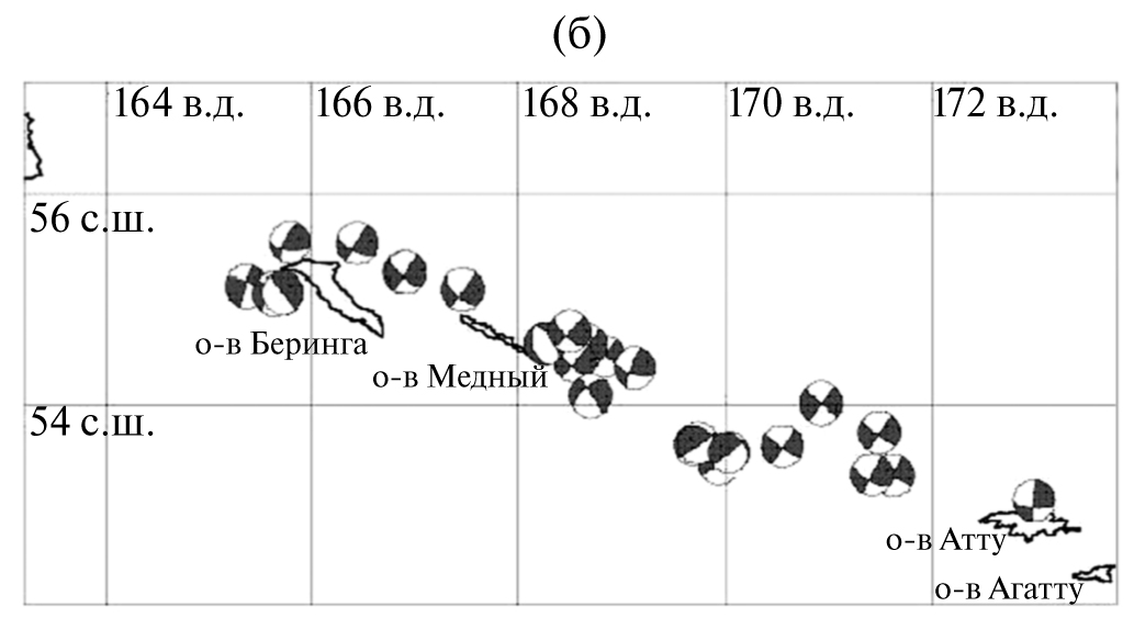 Изучение механизмов очагов землетрясений на Ближних и Командорских островах показывает, что здесь существует несколько различных зон сейсмотектонической активности [Newberry et al., 1986; Ruppert et al., 2012]. На рис. 8а, 8б приведены карты механизмов очагов землетрясений (МW ≥ 5.3 и МW ≥ 6.0 соответственно) западного сегмента Алеутской дуги, построенные по данным каталога СМТ [http://www.globalcmt.org].