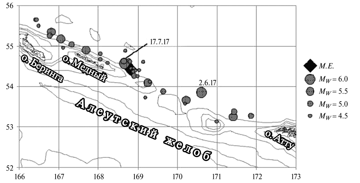 Восточнее, около острова Медный, одна из нодальных плоскостей фокальных механизмов очагов также направлена близпараллельно простиранию островной дуги и характеризуется в основном правосдвиговым типом смещений. Именно такой механизм характерен для очага землетрясения 17.07.2017 г.