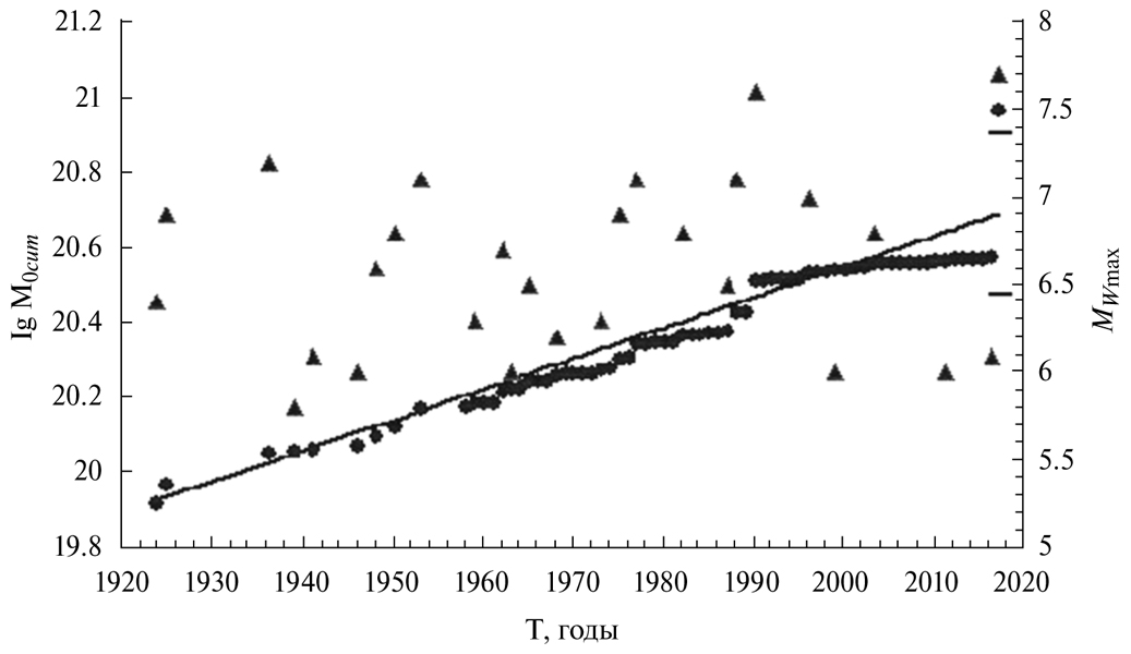Рис. 11. Временной ход высвобождения M0 cum в афтершоковой области землетрясения 17 июля с 1920 по 2017 гг. (левая ось ординат). Прямой линией показана линейная регрессия, аппроксимирующая наблюденные данные за период с 1924 по 1998 гг. включительно. Горизонтальными черточками обозначен 95% доверительный интервал регрессии в 2017 г. Треугольниками показаны магнитуды (правая ось ординат) наиболее сильных (MW ≥ 5.8) сейсмических событий.