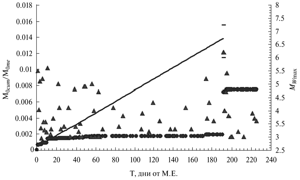 Линейная регрессия, проведенная по первым 14 дням развития афтершокового процесса, когда высвобождение M0 cum происходило приблизительно по линейному закону, имеет вид: