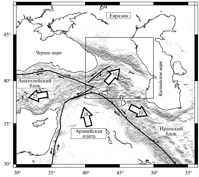 2. Fig. 1. Relative movements of lithospheric plates and blocks of the earth's crust / lithosphere in the Caucasian segment of the Alpine-Indonesian mobile belt modified fig. 1A from [Tan, Taymaz, 2006]. Large arrows indicate the direction and speed of movement of plates and blocks (mm / year inside large arrows) in accordance with GPS measurements [McClusky et al., 2000] (Eurasian coordinate system ITRF2000). The rectangle in the central part of the figure is the territory under consideration.