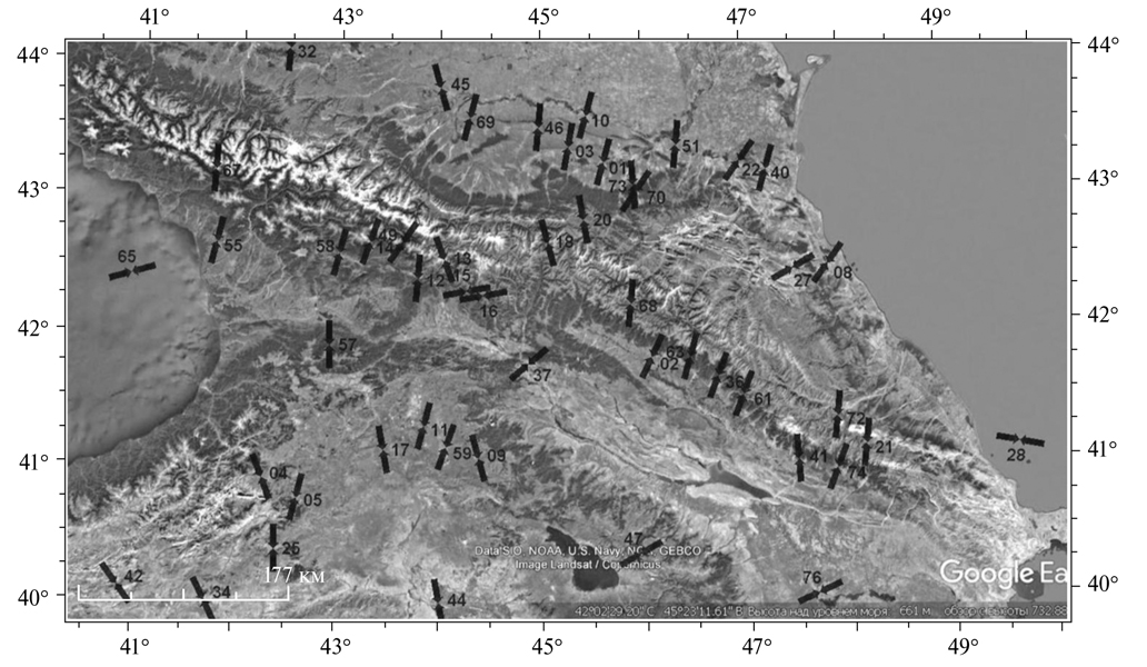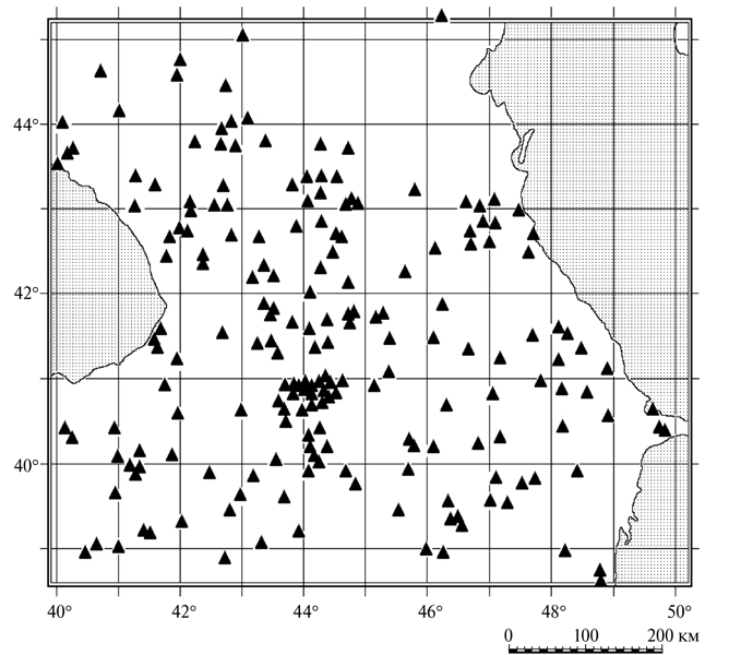 Представления о сейсмической сети, регистрировавшей сейсмические события в указанный период времени, можно получить из рис. 2, где представлено положение всех сейсмических станций в пределах указанной пространственной выборки, согласно базе данных в бюллетене ISC. Здесь приведены сейсмические станции, расположенные на территории Азербайджана, Армении, Грузии, Да­гестана, Северной Осетии, Краснодарского края, Ставрополья и частично Турции – всего около 230 пунктов.