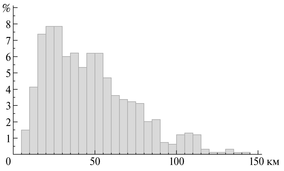 Как видим, плотность сейсмической сети в указанный период времени была достаточно высокой, что обеспечило практически полное окружение пунктами регистрации лоцируемых сейсмических событий на большей части территории Кавказа. Это позволило определять координаты эпицентров с точностью не хуже 10 км. С оценкой глубин ситуация сложнее. Как известно, для надежного определения глубины землетрясения необходимо наличие, по крайней мере, одной станции на расстоянии от эпицентра не более 2‑х глубин очага землетрясения. Мы, согласно схеме расположения станций на рис. 2, рассчитали распределение средних расстояний от каждой станции до ближайших к ней 2–3‑х соседних. Соответствующая гисто­грамма приведена на рис. 3. Согласно этого распределения 40% станций находятся друг от друга на расстояниях 40 км и менее, что позволяет определять сравнительно надежно глубины в земной коре лишь более 10 км, так как хотя бы одна станция, ближайшая к эпицентру лоцируемого землетрясения, располагается на расстоянии менее или равном 20 км и, соответственно, выполняется правило двух глубин очагов, необходимых для надежной оценки лоцируемой глубины. В то же время в пределах отдельных компактных групп станций это расстояние сокращается примерно вдвое и точность определения глубин существенно повышается. Еще около 40% станций располагаются относительно друг друга на расстояниях около 100 км, что позволяет лишь разделять по глубинам коровые и подкоровые сейсмические события. Наличие последних на территории Терско-Сунженской зоны Кавказа отмечалось в ряде исследований [Годзиковская, 1988; 2008; 2017; Габсатарова, 2010; Габсатарова и др., 2016].