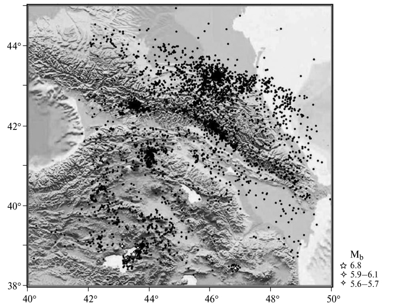 На территории Большого Кавказа произо­шло лишь 3 достаточно сильных землетрясения с mb  5.6–5.7 за рассматриваемый период времени (в 2008–2012 гг.). Более сильные сейсмические события с магнитудами 5.9–6.1 (2 события) и 6.8 (1 событие) произошли на территории Малого Кавказа в 2011–2012 гг., это при том, что уровень слабой сейсмичности здесь был ниже, чем на территории Большого Кавказа.