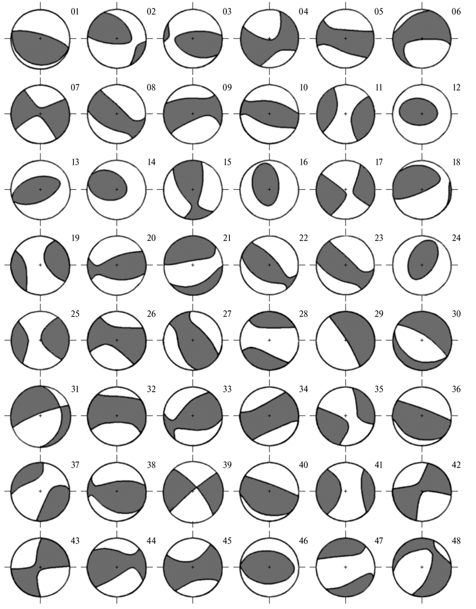 6. Fig. 5. Graphic solutions of the focal mechanisms of earthquakes (CMT solutions) in projection onto the lower hemisphere shown in the table. The solutions are borrowed from the ISC newsletter [www.isc.ac.uk] and from the Global Centroid Moment Tensor newsletter [www.globalcmt.org]. In the figures of focal mechanisms, the area of ​​stretching is blackened.