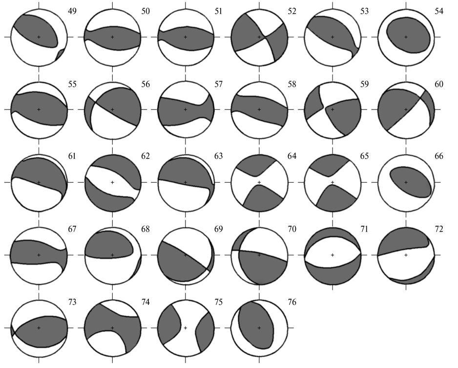 Графические решения приведенных в таблице фокальных механизмов (CMT-решения) показаны на рис. 5а, 5б. Подавляющее большинство этих фокальных механизмов показывают преобладание субгоризонтального сжатия. Лишь семь событий из 76 (с номерами 21, 30, 47, 48, 62, 71 и 72) показывают иную ориентацию главных осей – преобладание субвертикальной ориентации главной оси сжатия Р. В целом же преобладающая ориентация субгоризонтальных осей сжатия свидетельствует в пользу их направления вкрест простирания геологических структур Кавказа. Все эти землетрясения, для которых были получены решения механизмов очагов, произошли на небольших глубинах (менее 35 км, а подавляющее большинство на глубинах менее 20 км) в верхней части земной коры Кавказа.