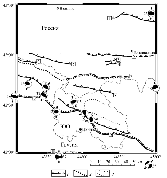 9. Fig. 7. Comparison of the layout of the thrusts of the Ossetian part of the Greater Caucasus ([Shevchenko et al., 2016]) with the nature of the stresses in the earthquake sources: 1 - large thrusts; 2 - contours of the southern slope of the Greater Caucasus; 3 - the middle part of the Chiauro-Dibrar synclinorium. The numbers in the squares are thrusts: “nameless” (1), Vladikavkaz (2), Kartsinsky (3), Moravhokhsky (4), Adylsu-Khares (5), Major Thrust of the Greater Caucasus (6), Buron-Larsky (7), Tibsky (8), Orkhevsky (9), Lechkhumsky (10), Suramsko-Gokishursky (11); SO - South Ossetia. The numbers next to the graphic solutions of the focal mechanisms correspond to the table and fig. five.