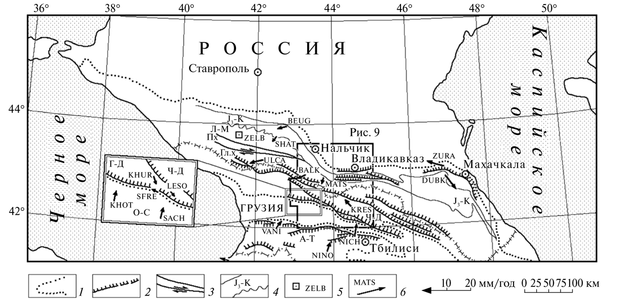 10. Fig. 8. Modern geodynamics of the Caucasus using GPS data (relative to the ZELB station) measured from 1991–1997. ([Shevchenko et al., 1999], fragment). 1 - contours of the mountain structures of the Greater and Lesser Caucasus; 2 - some of the main thrusts of the Caucasus; 3 - faults of the Forward Ridge zone; 4 - deposits of the Upper Jurassic – Cretaceous of the Northern slope of the Greater Caucasus; 5 - reference geodetic station ZELB; 6 - velocity vectors of horizontal displacements of geodetic points and their code names. Zones: А-Т - Adzharo-Trialety; GD - Gagro-Dzhavskaya; Gl.kh - Main ridge; LM - Labino-Malkinsky; OS — Okribo-Sachkherskaya; Px - Advanced Range; Ch-D - Chiauro-Dibrar synclinorium.