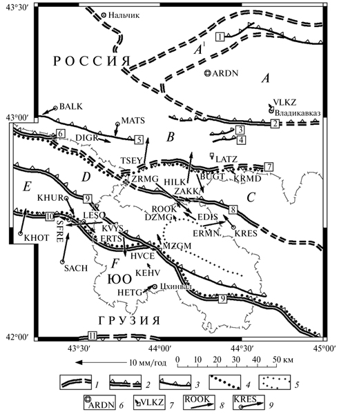 11. Fig. 9. Velocity vectors of horizontal displacements of GPS stations and points in Ossetia (relative to ARDN station) as measured in 2010–2013. (according to [Shevchenko et al., 2016; 2017] with additions from [Shevchenko et al. 1999]). The location of the picture is shown in Fig. eight: 1–2 - the boundaries of the elements of the tectonic structure of the region (1), including those represented by large thrusts (2); 3 - some other thrusts; 4 - contours of the southern slope trough; 5 - the middle part of the Chiauro-Dibrar synclinorium; 6 - ARDN reference station; 7 - GPS stations, their code names and horizontal offset velocity vectors; 8–9 - GPS points, their code names and horizontal displacement velocity vectors (after [Shevchenko et al., 2016; 2017] (8) and [Shevchenko et al., 1999] (9)). A, A1, B, C, D, E, F - tectonic zones (for explanations, see the text). SO - South Ossetia. The numbers in the squares - the boundaries of the zones, thrusts: "unnamed" (1), Vladikavkaz (2), Kartsinsky (3), Moravhohsky (4), Adylsu-Hares (5), Major thrust of the Greater Caucasus (6), Buron-Larsky ( 7), Tibsky (8), Orkhevo (9), Lechkhumsky (10), Suramsko-Gokishursky (11).