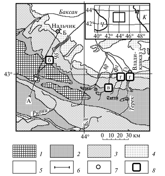 12. Fig. 10. A schematic geological map of a part of the Greater Caucasus and the location of the geological profiles shown in Fig. 11. At the sidebar - the location of the region in question (H - Black Sea, K - Caspian Sea). 1 - pre-Jurassic deposits and rocks; 2 - deposits of the Lower and Middle Jurassic; 3 - deposits of the upper Jurassic and Cretaceous; 4 - deposits of Paleogene and Neogene; 5 - Quaternary deposits; 6 - line of the geological profile AB; 7 - the location of the Lquezi anticline (see Fig. 11 a); 8 - location of the profiles through the Zylginskaya (b) and Khanikomskoy (c) anticlines, as well as along the Gizeldon and Terek rivers in the area of ​​the Vladikavkaz Fault (g, d). River designations: Ar - Ardon, BL - Bolshaya Liakhva, Gz - Gizeldon, Phg - Fiagdon, BH - Cherek Balkarsky.