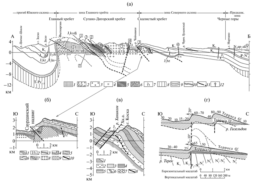 13. Fig. 11. Geological profiles through some elements of the tectonic structure of the Greater Caucasus. Location profiles, see Fig. ten: (a) - geological profile А-B through the zone of the Main Range of the Greater Caucasus and the trough of the Southern slope along the left side of the valleys of the r. Cherek Balkarsky – r. Zeskho [Shevchenko, 1984; Shevchenko et al., 2017]. Vertical and horizontal scales are the same: 1 - blyb type plagiogranites (γPz1?); 2 - Balkar-type granitoids and gneisogranitoids (γPz2); 3 - Ulukam-type granites (γPz3); 4 - granites of unclear type; 5–7 - crystalline schists, gneisses of the Uluchira suite (5), the Lower Beshengi subsuite (6) and the Upper Nezenegic subsuite (7) (Pt3); 8 - Middle Paleozoic - Triassic deposits undifferentiated; 9–10 - deposits of the Lower Jurassic Kistinsky (J1ks) (9) and Nessingy (J1bz) (10) suites; 11 - thrusts, faults; 12 - boreholes. Formations: J1ks - Kistin; J1bz - Besingiyi; J1ck - Cyclaur; J1mz  gl - Mizur and Galician; J1kz - Kazbek; J1k  dj - ksurtskaya and dzhimarinsky (?) Ardonsky series; J1–2gd - Gudoshaur. Figures in circles: 1–4 - anticlines: Lquezi (1), Suganskaya (2), Zylginskaya (3), Cericgelskaya (4). Figures in the squares: 1–3 - thrusts Adylsu-Haressky (1), Tyutyunsky (2), Saurdansky (3); 4 - Shahurdat reverse throw; 5 - Shtulu-Haresskaya sub thrust depression; (b) - geological profile on the left side of the valley r. Cherek Balkarsky through the Zylga anticline in the zone of the Main Range of the Greater Caucasus [Shevchenko, 1971; 1984]: 1 — quartz-biotite and quartzite schists of the Lower-Beshengi subsuite (Pt3); 2 - amphibole and quartz-biotite schists of the Upper Beshengi subsuite (Pt3); 3 - sandstones and gravels of the Upper Klinsbachian Nessingya Formation; 4 - sandstones, siltstones, mudstones of the Middle Aar-Aalen Jigiat Formation; 5 - mudstones with covers of lavas and tuffs of medium and acid composition of the Bayos Jor Formation; 6 - massive limestones of the Oxford tier, at the base there are thin callogenic and carbonate sediments; 7 - limestone and dolomites of the Cimmeridge layer; 8 - Middle Paleozoic Balkar-type biotite granites; 9 - Late Paleozoic two-mica granites of the Ulukam type; 10 - thrusts; (c) - geological profile in the valley of the r. Fiagdon through the Khanikom anticline in the zone of the Main Range of the Greater Caucasus [Shevchenko, 1972; 1984]: 1 - prealpine formations undifferentiated; 2 - Albitophirs of the Upper-Nemur-Nizhneplinsbakh Sadon Formation; 3 - sandstones of the Upper Klinsbakh Mizur Formation; 4 - mudstones of the Lower Taraar Galician Formation; 5 - sandstones, siltstones, argillites of the Middle-Dara-Lower Aalen and Upper Aalen strata of the Ardon series; 6 - terrigenous deposits of the Bayos-Zgid suite; 7 - massive limestones of the Oxford tier, at the base there are thin callovian terrigenous and carbonate deposits; 8 - thrust and discharges. (d) - longitudinal profiles of the valleys of the Gizeldon and Terek rivers in the zone of the Vladikavkaz Fault. The shading shows the thickest Q31 stratum. All terraces are in meters. Compiled by E.E. Milanovsky [1968].