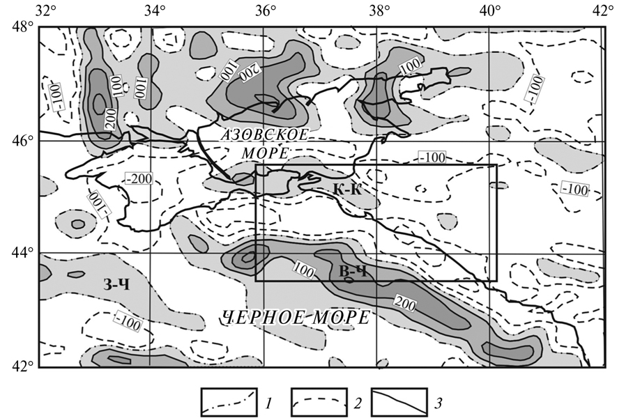 Рис. 2. Карта магнитного поля Азово Черноморского региона по WMM2015, Ta при h = 0, система координат – меркаторская: 1–3 – изолинии магнитного поля, нТл: 1 – нулевая, 2 – отрицательная, 3 – положительная. Буквами обозначены региональные положительные магнитные аномалии: К-К – Керченско-Кубанская, В Ч – Восточно-Черноморская, З-Ч – Западно-Черноморская. Прямоугольник – район исследования.