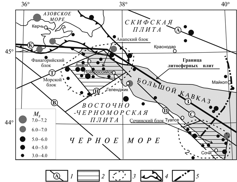 Северо-Западный сегмент Большого Кавказа принадлежит к Крымско-Кавказской сейсмической зоне Средиземноморского пояса. На территории Таманского и Керченского полуостровов и Северо-Западного Кавказа произошли крупные исторические сейсмические события [Никонов, 2000]: катастрофическое Понтикапейское землетрясение 63 г. до н. э. (М = 6.4–7.2), землетрясение 800 г. до н. э. (М = 6.5), Керченское землетрясение 275 г. (М = 6.4), Нижнекубанское землетрясение 1879 г. (М = 6.0). В инструментальный период магнитуда наиболее сильных землетрясений этого региона (12.07.1966 г., 12.04.1970 г., 07.11.1970 г., 09.11.2002 г., 13.03.2005 г., 10.12.2012 г.) не превышала 6.0.