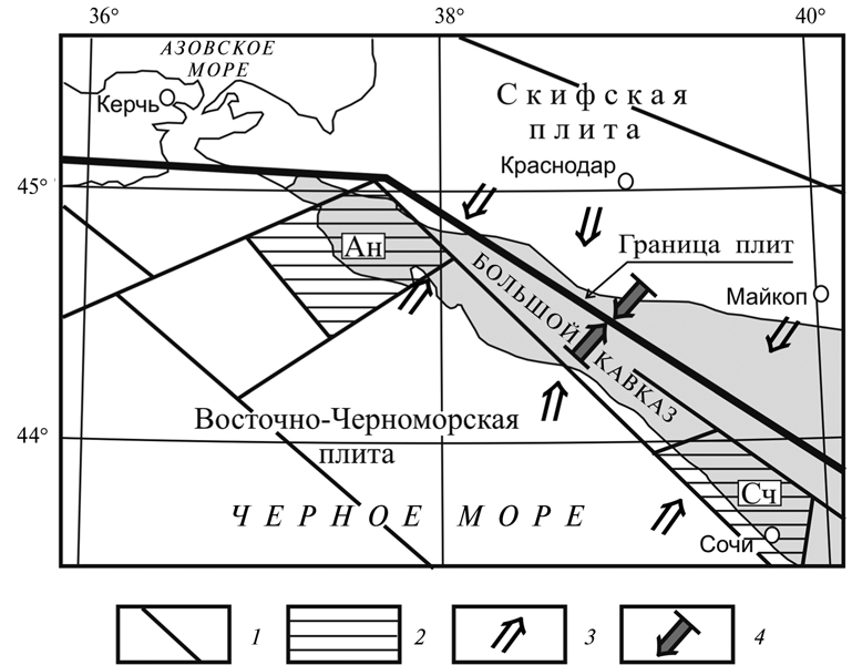 Глобальный уровень формирования сейсмогенерирующих напряжений Большого Кавказа определяется его положением в пределах Средиземноморского пояса. Региональный уровень характеризуют процессы возникновения очагов землетрясений в пределах геоблоков земной коры, а локальный уровень определяют блоки I и II порядка, которые во многом формируют как условия накопления энергии очага, так и ее рассеивания. Анализ регионального и локального уровней сейсмичности Северо-Западного Кавказа проведен на основе разработанной схемы тектонического строения консолидированной коры и положения границы Восточно-Черноморской микроплиты и Скифской плиты (рис. 4).