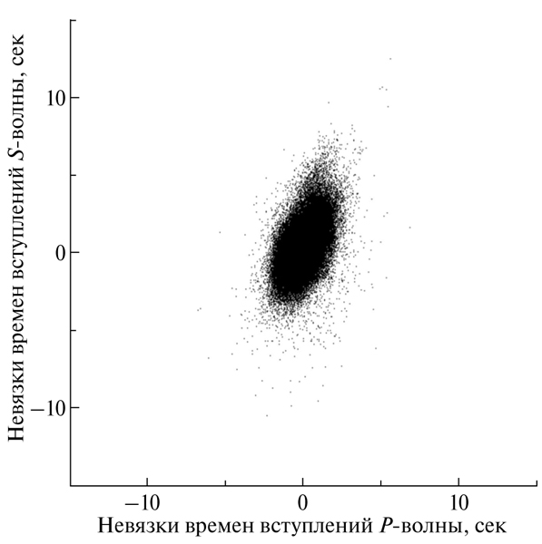 Невязки P- и S-волн на одной и той же станции нельзя считать независимыми. При расчетах гипоцентра этот эффект может оказаться весьма существенным, особенно в тех случаях, когда на части станций зарегистрировано лишь одно из времен вступления волн P или S. В любом случае, если корреляция невязок не учитывается, то искусственно завышается точность определения гипоцентра. В принципе, коррелированность невязок может меняться от станции к станции и в зависимости от местоположения очага землетрясения, при этом вклад могут давать как «теоретическая», так и «фактическая» составляющие ковариации. Здесь мы предполагаем, что эти детали несущественны по сравнению с усредненной моделью корреляции невязок P- и S-волн. На рис. 2 показана зависимость невязок для волны S в зависимости от невязки волны P для той же станции и того же землетрясения, построенная по всей базе данных невязок, описанной выше. Коэффициент корреляции составляет 0.55.