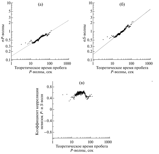 Как видно из рисунка, зависимости ошибок и от хорошо аппроксимируются в двойном логарифмическом масштабе прямыми линиями при Отклонение от этих зависимостей при малых значениях и в сторону больших значений можно интерпретировать как относительное возрастание вклада «фактической» компоненты в матрицу ковариации: по-видимому, ошибка определения времен вступления волн P и S составляет, соответственно, около 0.3 и 0.5 c. Коэффициент корреляции невязок P и S, как оказалось (рис. 3в), слабо зависит от величины Поэтому в качестве окончательной модели зависимости ошибок и от величины и модели величины мы приняли соотношения: