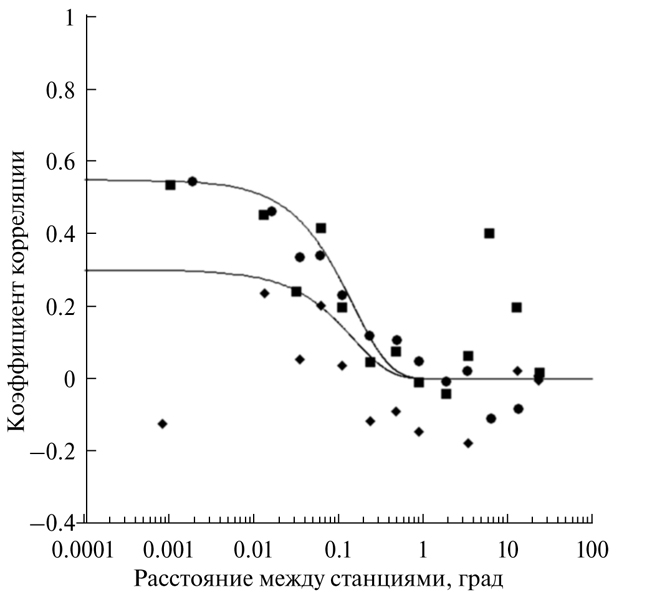 При анализе коэффициентов, соответствующих парам различных станций следует учитывать две разные ситуации. Корреляция невязок на близких станциях должна быть малой, если расстояние от обеих станций до гипоцентра невелико. При больших гипоцентральных расстояниях, наоборот, корреляция очень близких станций должна быть близкой к единице. При этом, однако, «фактическая» составляющая ошибок может снижать эту корреляцию из-за относительно существенной ошибки определения времен вступления. В данной работе мы моделируем первую ситуацию условием где расстояние между парой станций, Δ среднее расстояние от гипоцентра до каждой из двух станций. В этом случае мы принимаем значения коэффициентов и равными 0. Для второй ситуации в скользящем окне по величине шириной 0.1 град, мы оцениваем выборочную ковариацию для невязок, нормированных на соответствующие ошибки, определяемые соотношением (6). Благодаря нормировке коэффициенты и безразмерны и имеют смысл коэффициентов корреляции. При этом нормировка учитывает увеличение ошибок и, соответственно, всех ковариационных членов с увеличением гипоцентрального расстояния. Результаты представлены на рис. 4.