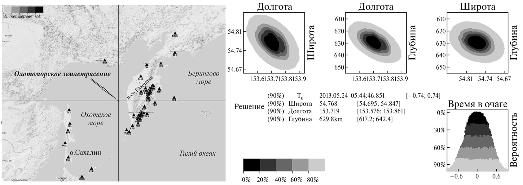 Рис. 5. Апостериорные распределения вероятностных оценок положения гипоцентра и времени в очаге Охотоморского землетрясения 24.05.2013, MW = 8.3. На карте слева треугольниками показаны станции, данные которых использованы для решения, область решения отмечена перекрестием линий и линиями уровня (область решения очень мала в масштабе карты). На диаграмме справа показаны линии уровня апостериорной вероятности для трех проекций, а также линии уровня маргинального распределения для времени в очаге. Линии уровня от 0 до 95% показаны оттенками серого цвета.