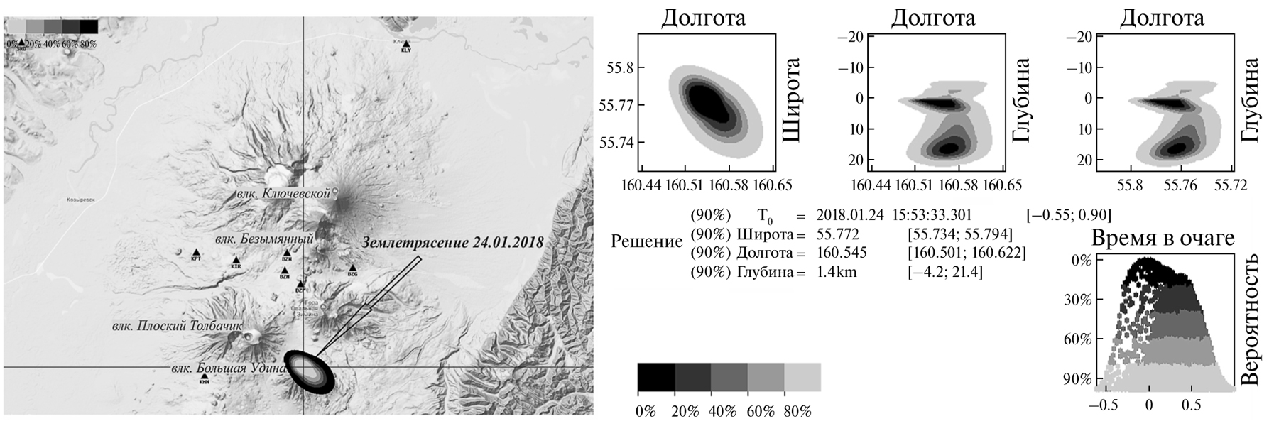 Рис. 8. Апостериорные распределения вероятностных оценок положения гипоцентра и времени в очаге сейсмического события в районе вулкана Удина 24.01.2018, ML = 1.5. Обозначения как на рис. 5.