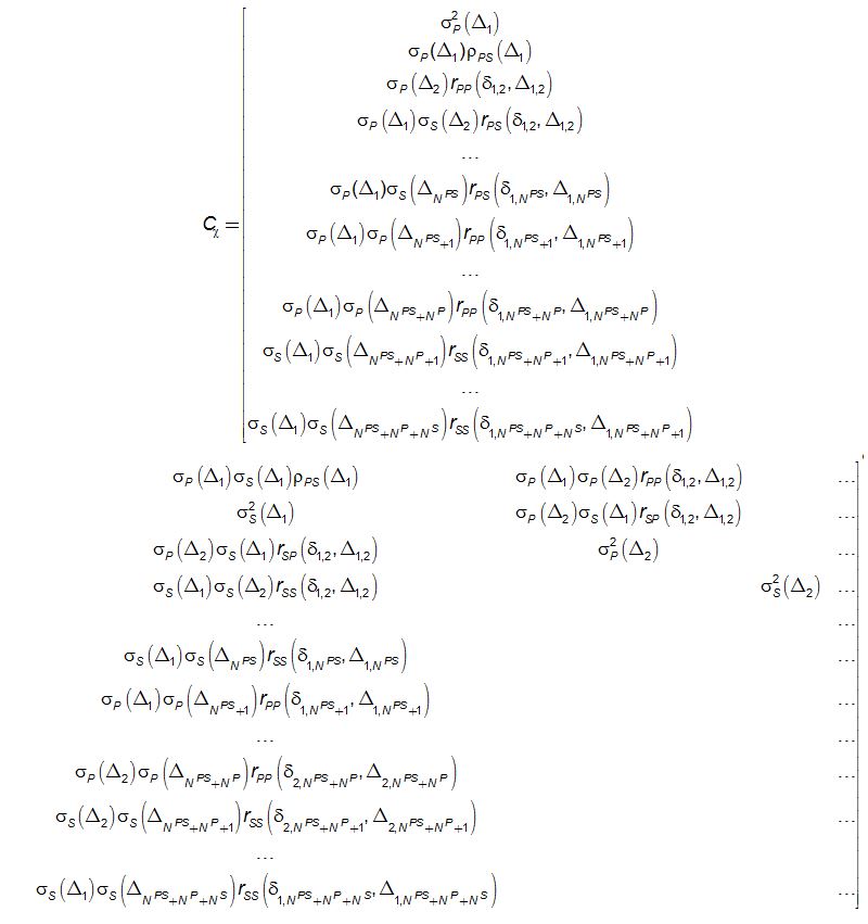В нашей работе мы предполагаем зависимость диагональных элементов матрицы от расстояния между гипоцентром и соответствующей станцией. Мы предполагаем также, что недиагональные члены масштабируются значениями соответствующих диагональных членов, но допускается также зависимость от расстояний до гипоцентра и/или между станциями соответствующих коэффициентов корреляции. Построение матрицы ковариации несколько осложняется тем фактом, что для части станций могут отсутствовать времена вступлений либо S-, либо P-волн. Ниже приведен общий вид вектора невязок и матрицы ковариации с учетом сделанных предположений. Нижний индекс i соответствует какой-либо станции, верхний индекс волне P или S. В начале следуют пар строк и столбцов матрицы и компонент вектора невязок, соответствующих станциям, для которых имеются вступления и P-, и S-волн, затем элементов, соответствующие станциям, для которых имеются вступления только волны P и, наконец, элементов, соответствующих станциям, для которых имеются вступления только волны S. Общее число вступлений волн составляет а число станций Вектор невязок составлен из разностей фактического и расчетного времен вступления волн. Расчетное время определено как для волны P или для волны S, где времена и пробега волн P и S от точки до станции рассчитываются по годографу.