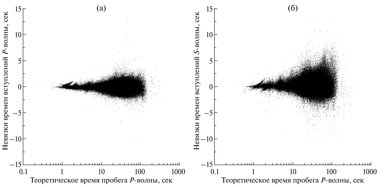Рис. 1. Зависимость разности расчетного и фактического времен вступления волн P (а) и S (б) от расчетного времени волны P по всем станциям и всем землетрясениям с классом 2010–2018 гг.