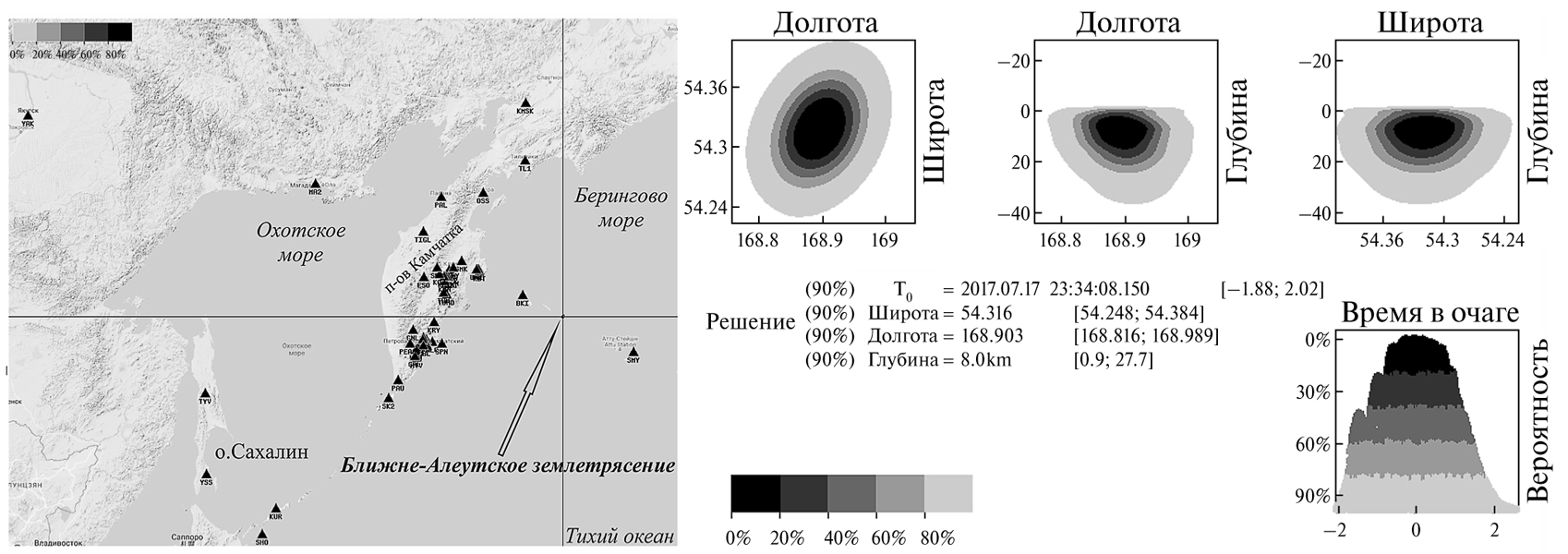 Рис. 6. Апостериорные распределения вероятностных оценок положения гипоцентра и времени в очаге Ближне-Алеутского землетрясения 17.07.2017, MW = 7.8. Обозначения как на рис. 5.